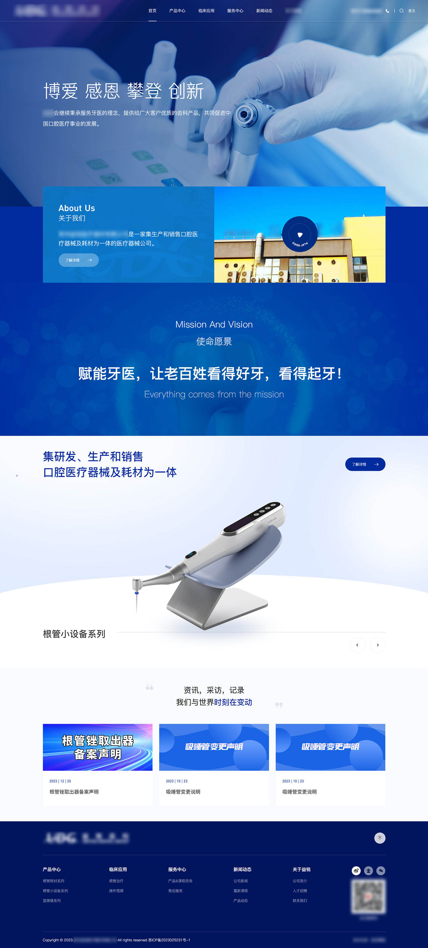 网站以“博爱 感恩 攀登 创新”为精神内核,锚定“服务牙医、普惠百姓”的使命愿景,明确“赋能牙医,让老百姓看得好牙,看得起牙”的价值主张。通过品牌理念与使命愿景的双层表达,既强化企业“专业医疗”的行业属性,又传递“普惠民生”的社会价值,为用户构建信任基础。